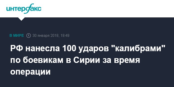 Москва. 30 января. INTERFAX.RU - Корабли и подводные лодки Военно-морского флота РФ нанесли сто ударов крылатыми ракетами "Калибр" по боевикам в Сирии, сообщил министр обороны РФ Сергей Шойгу, выступление которого приведено на сайте министерства.