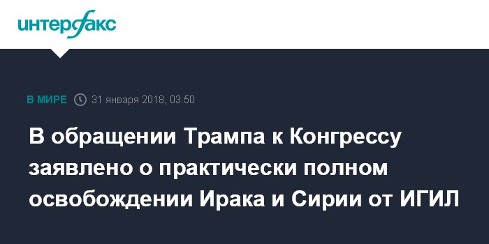 Москва. 31 января. INTERFAX.RU - Почти сто процентов территории Ирака и Сирии, находившейся когда-либо под контролем "Исламского государства" (ИГИЛ, запрещено в РФ) освобождены благодаря действиям международной коалиции, возглавляемой США, говорится в тексте обращения президента Дональда Трампа к Конгрессу, фрагменты которого распространил Белый дом.
