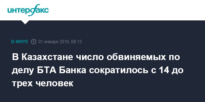 Москва. 31 января. INTERFAX.RU - В суде №2 Медеуского района Алма-Аты во вторник в ходе предварительных слушаний по делу о растрате средств казахстанского БТА Банка число обвиняемых сократилось с 14 до трех человек, передал корреспондент "Интерфакса" из зала суда.