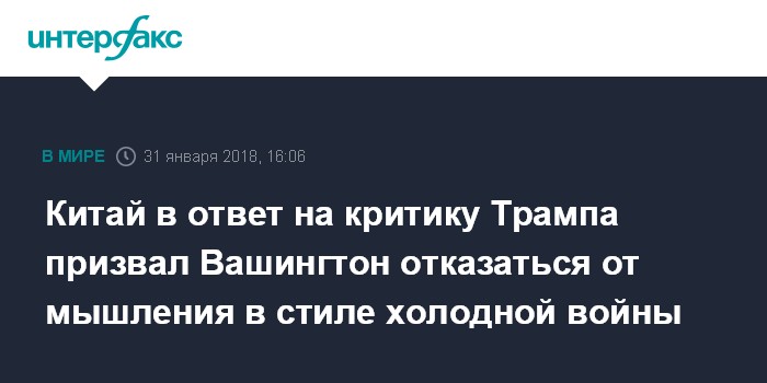 Москва. 31 января. INTERFAX.RU - Пекин призвал Вашингтон оставить в стороне образ мышления в стиле холодной войны после того, как американский президент Дональд Трамп упомянул Китай среди угроз ценностям США, сообщают в среду местные СМИ.