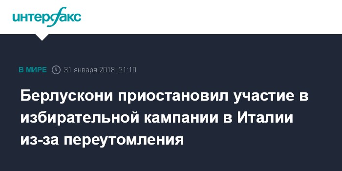 Москва. 31 января. INTERFAX.RU - Бывший председатель Совета министров Италии и лидер партии "Вперед, Италия" Сильвио Берлускони временно прекратил участие в кампании перед парламентскими выборами, сообщает в среду итальянская газета La Repubblica.