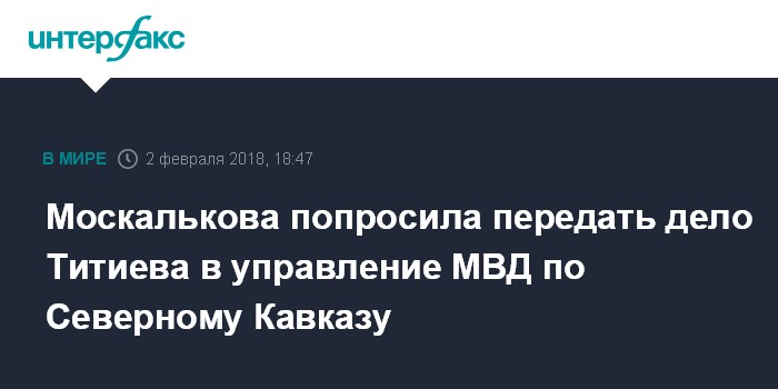 Москва. 2 февраля. INTERFAX.RU - Уполномоченный по правам человека в РФ Татьяна Москалькова обратилась к замминистра внутренних дел Александру Романову с просьбой передать дело руководителя чеченского представительства правозащитного центра "Мемориал" Оюба Титиева в главное управление МВД по Северо-Кавказскому федеральному округу.