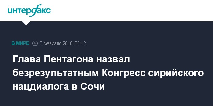 Москва. 3 февраля. INTERFAX.RU - Участникам Конгресса сирийского национального диалога в Сочи не удалось добиться какого-либо результата, считает глава Пентагона Джеймс Мэттис.