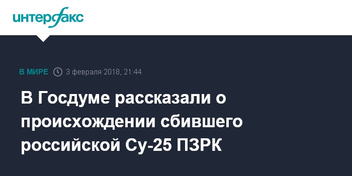 Москва. 3 февраля. INTERFAX.RU - Переносной зенитно-ракетный комплекс (ПЗРК), которым был сбит российский Су-25, несколько дней назад завезли в Сирию из сопредельного государства, заявил "Интерфаксу" координатор группы дружбы парламента Сирии и Госдумы, первый зампредседателя организации ветеранов "Боевое братство" Дмитрий Саблин.