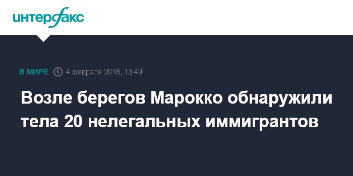 Москва. 4 февраля. INTERFAX.RU - Спасательные службы Марокко извлекли из воды тела 20 нелегальных иммигрантов, которые заметили накануне с испанского судна в Средиземном море, передают в воскресенье западные СМИ.