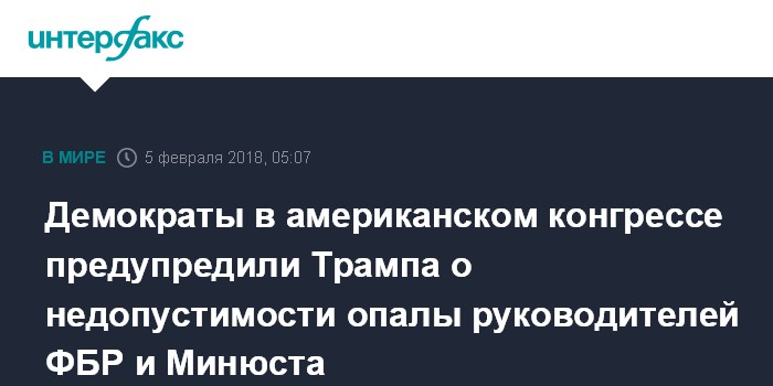 Москва. 5 февраля. INTERFAX.RU - Сенаторы-демократы конгресса США предупредили президента Дональда Трампа, что дискриминационные меры в отношении руководства правоохранительных структур, в частности, ФБР и министерства юстиции, могут привести к серьезным негативным последствиям.
