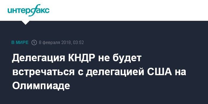 Москва. 8 февраля. INTERFAX.RU - У высокопоставленной северокорейской делегации, которая прибудет на церемонию открытия Олимпийских игр в Пхёнчхан, нет желания встречаться с представителями американской делегации, сообщило агентство "Рёнхап" со ссылкой на центральное информационное агентство КНДР (KCNA).