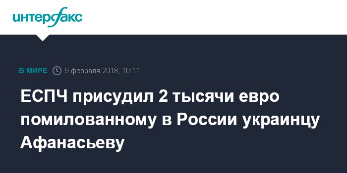 Москва. 9 февраля. INTERFAX.RU - Европейский суд по правам человека (ЕСПЧ) обязал Россию выплатить две тысячи евро помилованному в РФ в 2016 году гражданину Украины, уроженцу Крыма Геннадию Афанасьеву, защита которого подавала две жалобы в Страсбург на условия его перевозки.