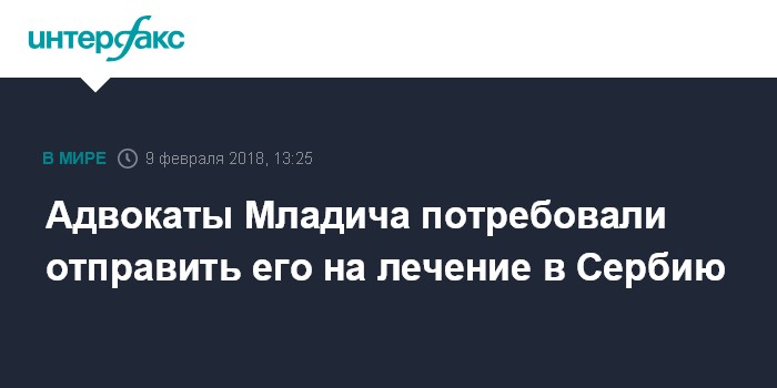 Москва. 9 февраля. INTERFAX.RU - Адвокаты Ратко Младича направили в Механизм остаточной компетенции Международного трибунала по бывшей Югославии (МТБЮ) требование передать сербского генерала на лечение в Сербию, заявил депутат Госдумы, глава "Российского общественного комитета в защиту генерала Младича" Павел Дорохин.