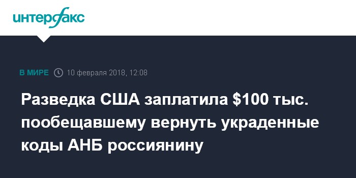 Москва. 10 февраля. INTERFAX.RU - Сотрудники американских разведывательных служб заплатили $100 тыс. некоему россиянину, пообещавшему вернуть им похищенное при кибератаке на Агентство национальной безопасности (АНБ) США секретное кибероружие, пишет в субботу газета The New York Times со ссылкой на источники в американских и европейских спецслужбах.