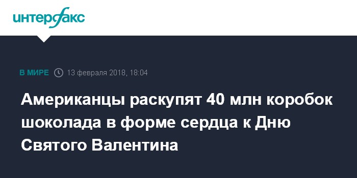 Москва. 13 февраля. INTERFAX.RU - Продажи шоколада и конфет на День святого Валентина в этом году продолжат расти, в объемном выражении они, вероятно, превысят докризисные максимумы, прогнозирует Национальная ассоциация кондитеров (NCA) США.