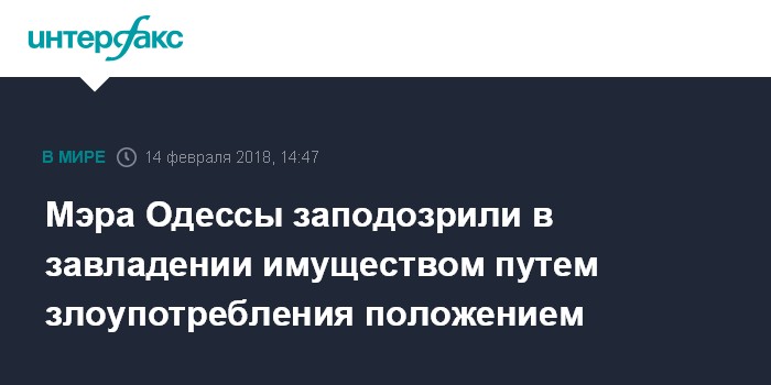 "14 февраля в аэропорту "Борисполь" детективы НАБУ и прокуроры САП в соответствии со ст.208 УПК Украины задержали Одесского городского голову и его заместителя, подозреваемых в совершении преступления, предусмотренного ч.5 ст.191 Уголовного кодекса Украины (завладение имуществом путем злоупотребления служебным положением"), - сообщается в среду на сайте Национального антикоррупционного бюро Украины.