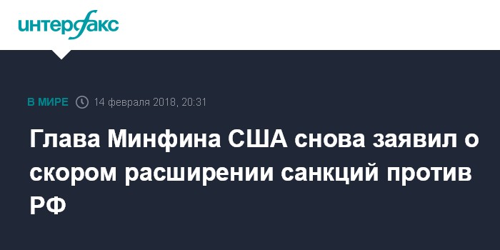 "Этих санкций следует ожидать в ближайшее время", - цитирует агентство Bloomberg выступление министра в финансовом комитете Сената.