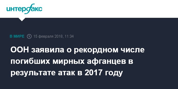 Москва. 15 февраля. INTERFAX.RU - Почти 2,3 тысячи мирных жителей погибли или получили ранения при нападениях в Афганистане в 2017 году, что стало рекордным показателем за все время нынешнего конфликта в этой стране. Об этом говорится в докладе Миссии ООН по содействию Афганистану, распространенном в четверг.