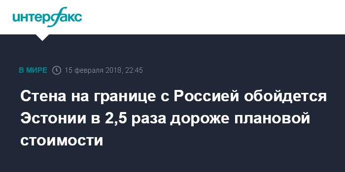 Москва. 15 февраля. INTERFAX.RU - Правительство Эстонии намерено продолжить строительство стены на границе с Россией по всей ее длине, несмотря на значительное удорожание проекта - с 70 до 188 млн долларов, заявил в четверг премьер-министр Юри Ратас.