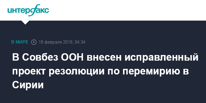 Москва. 16 февраля. INTERFAX.RU - В ООН рассматривается исправленный проект резолюции по перемирию в Сирии, который не запрещает правительственным силам наносить удары по террористическим структурам ИГ и "Аль-Каида" (запрещены в РФ) в провинции Идлиб, сообщают СМИ со ссылкой на источники во всемирной организации.