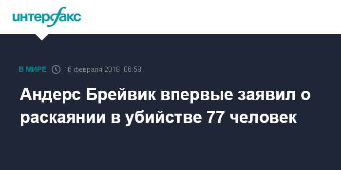 Москва. 16 февраля. INTERFAX.RU - Андерс Брейвик, осужденный за два теракта, в результате которых погибло 77 и пострадало полторы сотни человек, впервые заявил о том, что раскаивается в содеянном, пишет в четверг норвежское издание Verdens Gang.