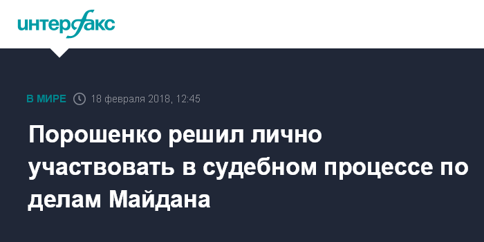 Москва. 18 февраля. INTERFAX.RU - Президент Украины Петр Порошенко заявляет о намерениях участвовать в судебном процессе по расследованию преступлений на Майдане в 2014 году.