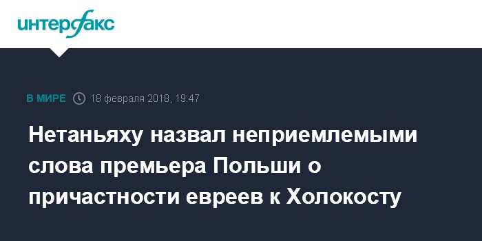 Москва. 18 февраля. INTERFAX.RU - Премьер-министр Израиля Биньямин Нетаньяху в ходе телефонного разговора со своим польским коллегой Матеушем Моравецким заявил о неприемлемости его слов о причастности к Холокосту некоторых представителей еврейского народа.