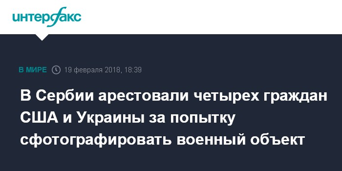 Москва. 19 февраля. INTERFAX.RU - В Сербии арестовали двух граждан США и двух гражданок Украины за попытку при помощи дрона сфотографировать военный объект в Белграде, а также проникнуть на его территорию, сообщает в понедельник Associated Press.