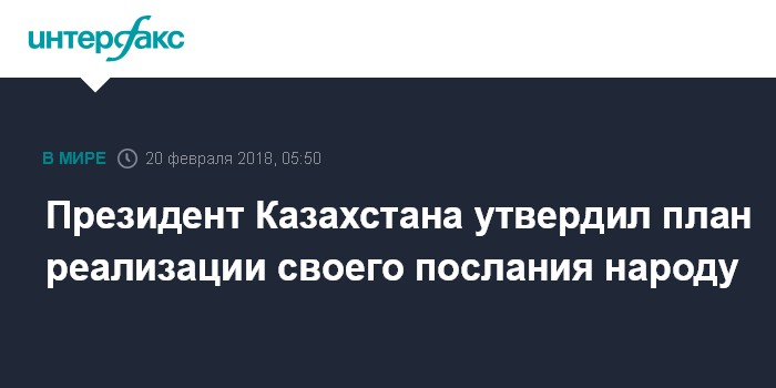 Москва. 20 февраля. INTERFAX.RU - Президент Казахстана Нурсултан Назарбаев своим указом утвердил общенациональный план мероприятий по реализации своего послания народу страны от 10 января 2018 года.