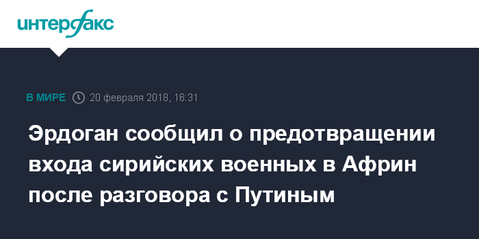 Москва. 20 февраля. INTERFAX.RU - Турция воспрепятствовала размещению сирийских проправительственных сил в районе Африна после телефонного разговора турецкого президента Реджепа Эрдогана с президентом России Владимиром Путиным.
