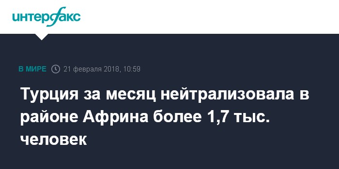 Москва. 21 февраля. INTERFAX.RU - Турецкое военное командование заявило о нейтрализации близ Африна свыше 1,7 тысячи ополченцев, поддерживающих сирийского президента Башара Асада, а также боевиков из группировки "Исламское государство" (ИГ, запрещена в РФ), передает в среду Анатолийское агентство новостей.