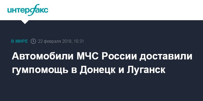 Москва. 22 февраля. INTERFAX.RU - Грузовые автомобили МЧС России в очередной раз доставили в Донецк и Луганск гуманитарную помощь, сообщили в четверг "Интерфаксу" в пресс-службе министерства.