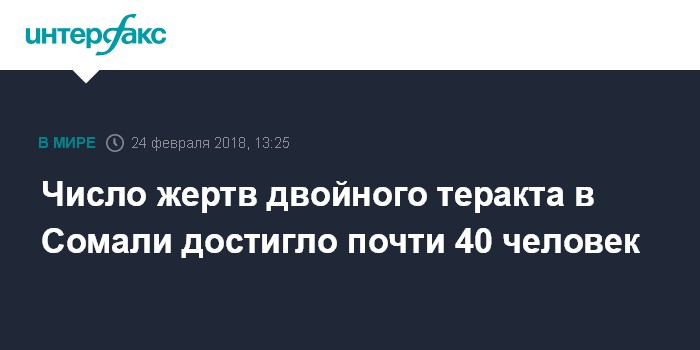 Москва. 24 февраля. INTERFAX.RU - По меньшей мере, 38 человек погибли в результате терактов, произошедших в столице Сомали Могадишо, передают в субботу западные СМИ со ссылкой на медиков.