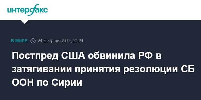 Москва. 24 февраля. INTERFAX.RU - Постпред США при ООН Никки Хейли обвинила Россию в отсрочке принятия резолюции о перемирии в Сирии, указав, что в этой стране гибнут люди, пока российская делегация согласовывает с Москвой свою позицию и обсуждает результаты работы с сирийской стороной.