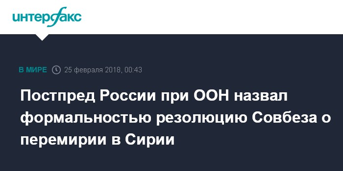 Москва. 25 февраля. INTERFAX.RU - Принятие резолюции Совета Безопасности ООН по Сирии не приведёт к незамедлительному наступлению перемирия, для этого необходимо побудить враждующие стороны к выполнению положений этого документа, заявил постпред РФ при ООН Василий Небензя.