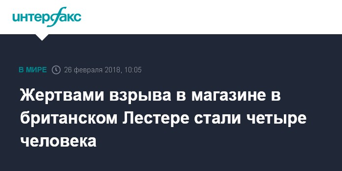 Москва. 26 февраля. INTERFAX.RU - При взрыве в воскресенье в магазине в британском городе Лестере погибли четыре человека, говорится в заявлении полиции графства Лестершир, распространенном в понедельник.