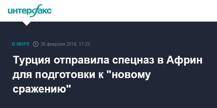 Москва. 26 февраля. INTERFAX.RU - Турция направила в район сирийского города Африна силы специального назначения для ведения боевых действий с курдскими вооруженными формированиями в городской местности, сообщил в понедельник вице-премьер Турции Бекир Боздаг.