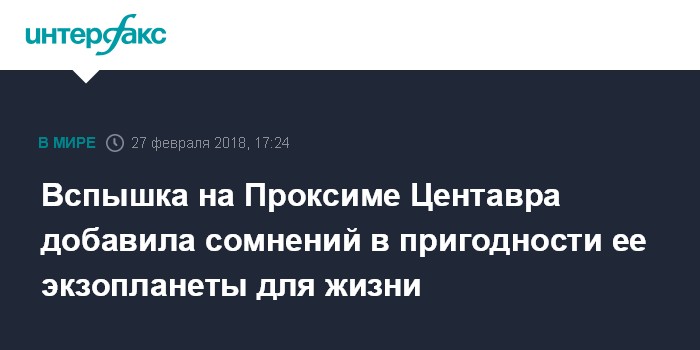 Москва. 27 февраля. INTERFAX.RU - Астрономы зарегистрировали мощную вспышку на ближайшей к Солнцу звезде, Проксиме Центавра, пишет сайт N+1 со ссылкой на статью, принятую к публикации в Astrophysical Journal Letters.
