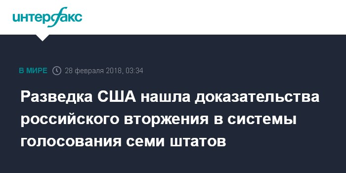 Москва. 28 февраля. INTERFAX.RU - У разведсообщества США появились существенные доказательства того, что сайты и системы регистрации голосования в семи штатах "были вскрыты" действовавшими при поддержке России тайными агентами еще до президентских выборов 2016 года, утверждает телеканал NBC News со ссылкой на нескольких американских чиновников.