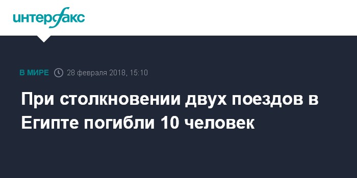 Москва. 28 февраля. INTERFAX.RU - В результате столкновения двух поездов в Египте погибли 10 человек, сообщает в среду телеканал Al Arabiya.