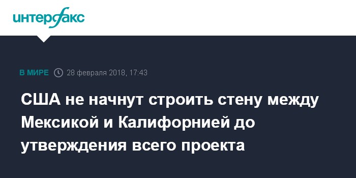 Москва. 28 февраля. INTERFAX.RU - Строительство участка стены на границе с Мексикой в штате Калифорния не начнется, пока весь проект стены не будет одобрен, заявил в среду президент США Дональд Трамп.