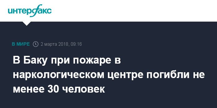 Москва. 2 марта. INTERFAX.RU - В результате пожара в здании республиканского наркологического центра в Баку погибли не менее 30 человек. Об этом сообщает местное агентство APA.