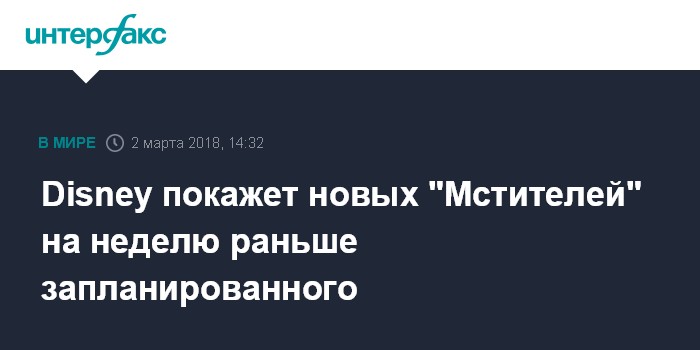 Москва. 2 марта. INTERFAX.RU - Киностудия Walt Disney и создатель комиксов Marvel на неделю перенесли мировую премьеру своего блокбастера "Мстители: Война бесконечности" - с 4 мая на 27 апреля.