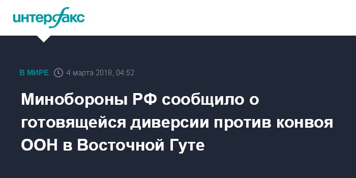 Москва. 4 марта. INTERFAX.RU - Российские военные заявляют, что боевики в Восточной Гуте готовят диверсию против гуманитарного конвоя ООН.