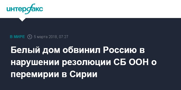 Москва. 5 марта. INTERFAX.RU - Россия не соблюдает требования резолюции СБ ООН 2401 о перемирии в Сирии, с таким обвинением выступил Белый дом.
