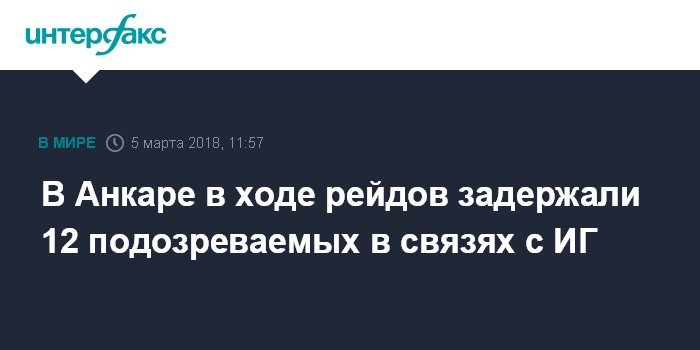 Москва. 5 марта. INTERFAX.RU - Турецкая полиция в ходе рейдов в Анкаре задержала 12 человек, подозреваемых в связях с группировкой ИГ (запрещена в РФ), после того, как из-за террористической угрозы в городе были повышены меры безопасности и приостановлена работа посольства США, сообщает со ссылкой на прокуратуру Анкары турецкое издание "Сабах".