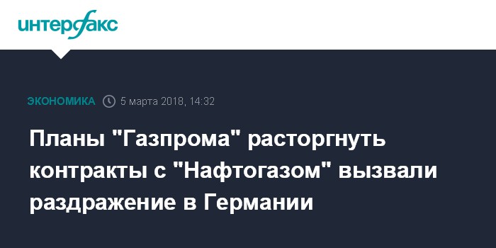 Москва. 5 марта. INTERFAX.RU - Правительство Германии озабочено и раздражено решением "Газпрома" расторгнуть контракты на поставку и транзит газа с "Нафтогазом Украины", передает агентство Bloomberg слова официального представителя правительства Штефана Зейберта.