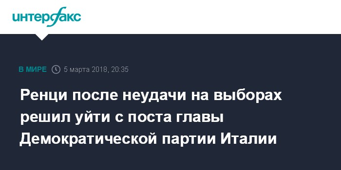 О решении Ренци уйти в отставку ранее со ссылкой на источники в партии сообщало агентство АНСА. Агентство называет прошедшие парламентские выборы, на которых демократы не смогли набрать и 20% голосов в каждой палате, "темнейшим часом" для партии.
