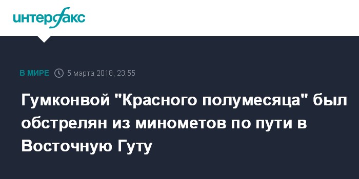 Москва. 5 марта. INTERFAX.RU - Боевики из минометов обстрелял конвой гуманитарный конвой ООН и "Красного полумесяца", доставивший в понедельник помощь для для населения Восточной Гуты, сообщили российские военные.