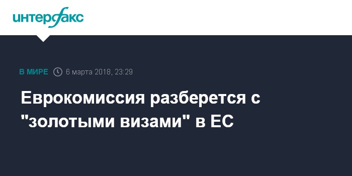 Москва. 6 марта. INTERFAX.RU - Еврокомиссия до конца года подготовит доклад о странах Евросоюза, которые предоставляют постоянное место жительства в обмен на инвестиции - "золотую визу". В докладе изложат действия комиссии в связи с "золотыми визами" и правила о такой национальной практике, рассказал представитель Еврокомиссии Кристиан Виганд во вторник на брифинге в Брюсселе.