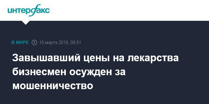 Москва. 10 марта. INTERFAX.RU - Мартин Шкрели, бывший исполнительный директор компании Turing Pharma, приговорен судом Бруклина к семи годам лишения свободы за "мошенничество с ценными бумагами", соощила The Wall Street Journal.