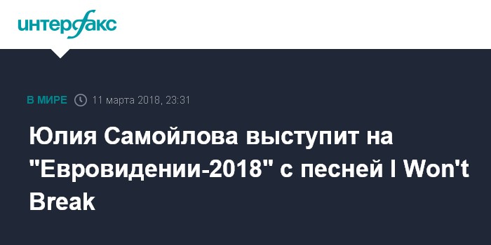 Москва. 11 марта. INTERFAX.RU - Первый канал показал в воскресном эфире программы "Время" песню "I Won't Break", с которой певица Юлия Самойлова выступит на международном музыкальном конкурсе "Евровидение-2018" в Лиссабоне.