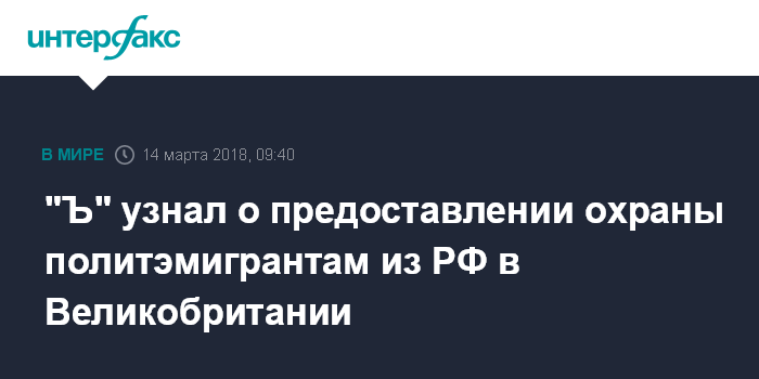 Москва. 14 марта. INTERFAX.RU - Некоторым гражданам России, получившим убежище в Великобритании, предоставлена охрана. Об этом сообщает сегодня газета "Коммермсантъ" со ссылкой на свои источники.