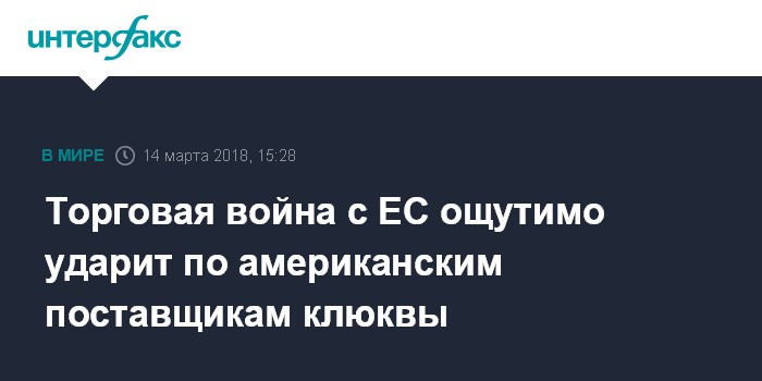 Москва. 14 марта. INTERFAX.RU - Обострение торговых отношений между США и ЕС может резко негативно отразиться на американских поставщиках клюквы, для которых Европа является главным рынком сбыта.